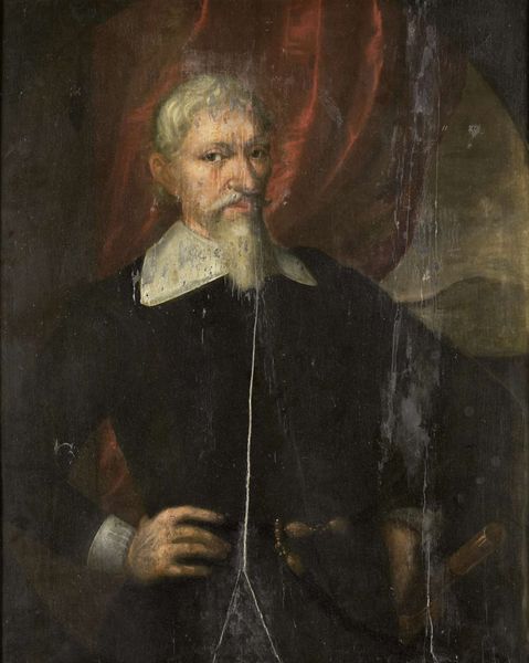 Editor: So, this is a portrait of Bartholomeus Andrio Walsdorffer, likely painted sometime between 1605 and 1615, created using oil paint. There's an intensity to his gaze that's quite compelling. What strikes you most about it? Curator: I see a fascinating intersection of individual portrayal and societal expectations. The imposing figure of Walsdorffer, his attire, even the presence of weaponry, aren’t simply about capturing a likeness. How might his armor project social power and status within the cultural norms of the time? Editor: It definitely feels intentional. Do you think the darkness surrounding him is symbolic? Curator: The dark background does contribute to the drama. We could think of the stark contrast between his pale face and collar against the darkness not just as a stylistic choice but reflecting the tumultuous times or the artist's or Walsdorffer’s perceived role within those conflicts. Consider the role portraiture played in shaping perceptions and solidifying social hierarchies during this period. Editor: So, you are suggesting this isn’t just a record, but an active participant in his public identity. Curator: Precisely! Think about where such a portrait might have been displayed – a family home, a public hall? And consider who the intended audience would have been. What impact did that context have on shaping the reception of this artwork? Editor: I hadn't considered it in that context before. The act of seeing shifts its purpose altogether. Thank you! Curator: Likewise! Considering art within a larger social and historical framework encourages a far richer understanding of the portrait's meaning.
