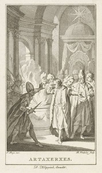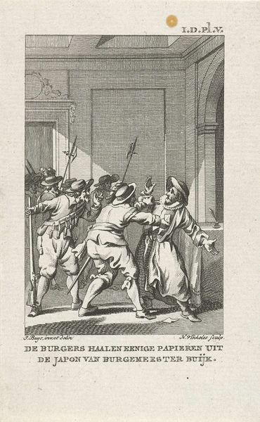 Curator: This drawing by Jacobus Buys, made between 1793 and 1795, depicts "Wigbold Ripperda addressing the citizens and militia of Haarlem, December 1572." Editor: The scene certainly carries weight. You can feel the tension radiating off those gathered. It looks to me like a stage – all very carefully presented for maximum impact. Curator: The artist utilizes the symbolic weight of leadership to portray a powerful moment. The raised hand, a universally understood symbol for directing attention, indicates Ripperda's command over his audience and the historical narrative at play. Notice how the light seems to almost shine on him as well? Editor: Absolutely, but it also brings out the qualities of the paper itself. You can really see the pen and ink's interaction with the page here. The textures seem so subtle; I'd love to know what kind of paper was used. This was a preliminary work, and to see those decisions laid bare, that materiality is exciting! The lines create the value! Curator: In that moment, Ripperda embodied defiance and resistance. These ideas continue to be potent motivators in the realm of visual rhetoric. His clothing is carefully detailed too - do you feel how it contributes to the creation of authority here? Editor: No doubt, the clothing marks class, but I see other class tensions. These guys seem so overdressed for this interior space. This wasn't off-the-cuff; there's staging involved here. Curator: Perhaps Buys hoped to inspire feelings of civic virtue, given that he was making this around the time of other revolutions. This image, therefore, echoes earlier ideals in a potent mix of historical reenactment. Editor: True. And consider the practical aspect. Ink and pen were comparatively accessible artistic materials, perfect for circulating such revolutionary ideas through prints. It brings the heroic moment down to Earth. Curator: In thinking about historical reenactment and civic virtue I realize there are multiple avenues to explore the ideas being made. Editor: Agreed, whether its paper source or historical sources both seem relevant in viewing this.