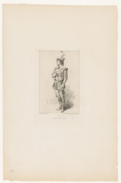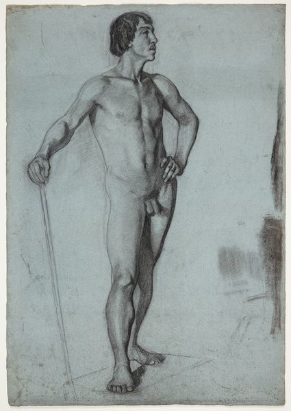 Editor: Here we have Albert Krüger's "Bronzen beeld," or "Bronze Statue," created around 1896. It looks like a drawing, perhaps preparatory, for a sculpture. The shading makes it look quite imposing, almost monumental. What can you tell me about this image? Curator: Considering this drawing, let's examine the means of its production alongside the end product. Krüger chose pencil and paper to depict what should be a bronze sculpture. This displacement highlights a transition in artistic values and methods. What's compelling here is the use of readily available, inexpensive materials to represent something of value: a classical bronze figure. Does this point toward democratizing art or does it simply reproduce hierarchical structures? Editor: That's a great question. I guess I hadn’t considered that tension. He’s recreating something "high art" with everyday materials. So, is Krüger commenting on the role of labor in replicating these traditional forms? Curator: Precisely. We can think about the labor involved in creating a bronze sculpture versus the labor of producing this drawing. The economic realities influence who can produce art, what can be depicted, and who has access to those objects. This paper drawing makes it more accessible, but at the same time flattens the artistic process itself and arguably shifts its value. Does this preparatory sketch ever achieve the value it is meant to represent? Or does it become valuable precisely as it remains unfulfilled? Editor: That’s so interesting. So looking closely at process and materials opens up this entire other layer of meaning about art making itself. Curator: Indeed. Material analysis urges us to go beyond aesthetic judgments. We reflect on social dynamics, labor, and access embedded within the work. The choices behind production. Editor: I’m walking away seeing this piece with entirely fresh eyes! Curator: Wonderful. Hopefully this perspective helps us analyze what’s included in the piece and also what’s left out in the final translation of the bronze figure onto paper.
