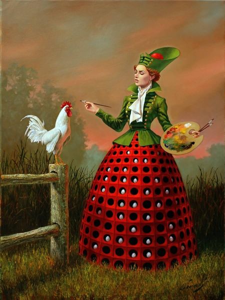 Michael Cheval made this oil on canvas painting, titled *Taming Of A Shrew*, using traditional fine art materials. Oil paint, beloved for its luminosity and blendability, allows for the creation of seamless gradients that make this scene so dreamlike. The artist has skillfully employed techniques like layering and glazing to achieve such intricate detail. We see this in the subtle textures of the woman's hat, and in the rooster's feathers, built up through many thin coats of paint, capturing light in a uniquely vibrant way. This is a time consuming process, that demands highly skilled, and very patient labor. The title itself - *Taming of a Shrew* - implies a social commentary. The ‘shrew’ of the title could be the rooster, tamed by the woman's gentle hold, which is a metaphor for societal expectations of women. By appreciating the labor, materials, and meaning embedded in *Taming Of A Shrew*, we gain a deeper understanding of Cheval's artistic practice and its engagement with social commentary.