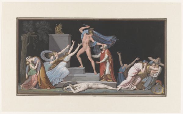 This Frieze with Antique Motifs is an engraving on paper, made by Louise Pithoud. Its monochromatic palette emphasizes the graphic nature of the work. The engraving process would have required significant skill. Pithoud would have used a burin, a specialized tool, to carve lines into a metal plate. This painstaking process, demanding absolute precision, results in fine lines and intricate details that define the classical figures. Look closely, and you’ll notice how the texture of the paper interacts with the ink, creating subtle variations in tone. The frieze is designed to resemble an ancient relief, something monumental, rendered through labor-intensive, small-scale processes. This contrast invites reflection on the labor involved in both the original classical sculptures and Pithoud's act of reproduction, highlighting the value and skill associated with traditional printmaking. It’s a dialogue across time, mediated by the craft of engraving.