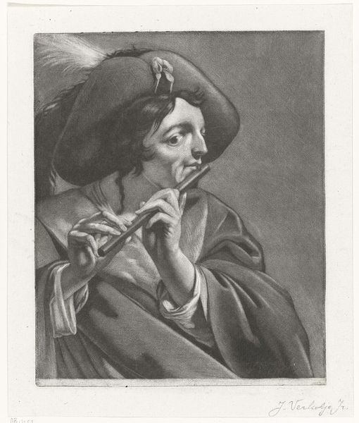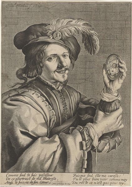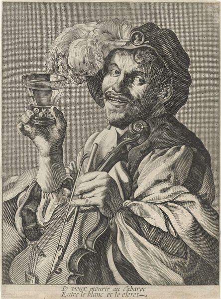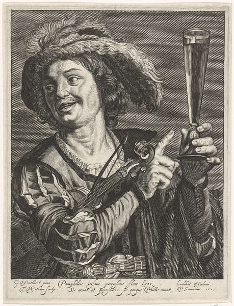 Editor: This is “Boy with an Inverted Glass” by Theodor Matham, dating from 1625 to 1629. It's an engraving and currently resides in the Rijksmuseum. The boy’s expression is just so striking – a mixture of smugness and maybe even a little mischief. What's your take on it? Curator: It’s important to understand these images within the context of the Dutch Golden Age. What role did engravings play in shaping public opinion and disseminating information? The elaborate attire and theatrical pose of the boy hint at a connection with wealth and social status. But then consider the inverted glass. Is it a symbol of vanitas, the fleeting nature of earthly pleasures, made fashionable in broader artistic and socio-political discourses by artists like Hals and Rembrandt? Editor: Vanitas…interesting. So, his playful smirk might actually be masking a deeper commentary on the transience of life and wealth? I was drawn to the engraving as a simple portrait. But you are placing the piece in the flow of Dutch history, suggesting an allegory? Curator: Precisely. And think about the function of the image. Prints like these were not just artistic expressions, but often functioned as advertisements or propaganda. Can we consider the location in Rijksmuseum to change how audiences percieve art today, shifting from advertisement and into a work of art? Editor: I never thought about it that way. Shifting socio-political status can also happen for artistic expression over time. This makes me wonder about Matham himself - what sort of societal position was he occupying as an artist at the time? Curator: It prompts us to question how cultural and economic forces can propel art to higher planes in cultural value. Considering the piece as a tool in the social arena definitely adds depth. Editor: Definitely gives a different lens on how to think about 17th century portraiture and Dutch societal currents. Thank you!