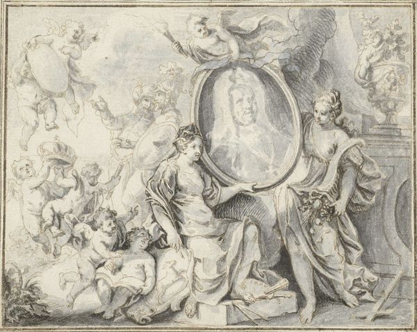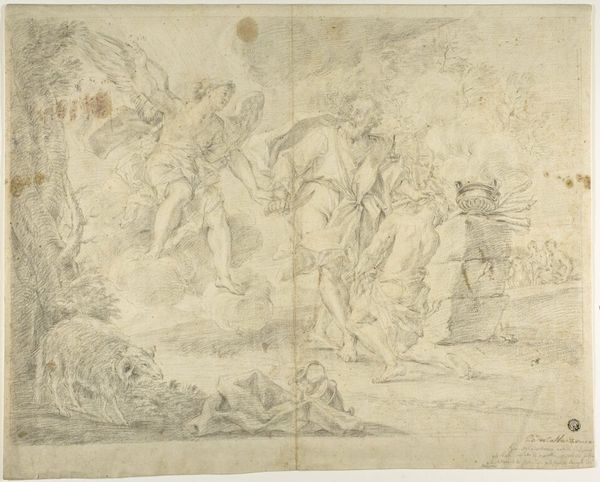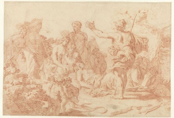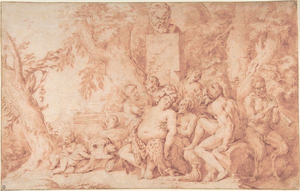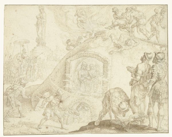 Editor: This drawing, titled "Scene of Witchcraft and Devil Worship" is by David Teniers the Younger. It seems to be done in ink and charcoal on paper. What strikes me immediately is the chaos of the composition – figures are crammed together, and the perspective is unsettling. How do you interpret this work? Curator: Formally, the dynamism is achieved through the layered composition. Note the stark contrast between the dense activity at the bottom and the relative emptiness above, yet they are interconnected. What do you notice about the artist's rendering of the figures? Editor: Well, they seem quite grotesque and exaggerated, almost cartoonish. Their postures and expressions amplify the overall feeling of disarray. Curator: Precisely. And observe the lighting. The figures around the perimeter and overhead seem to emanate light, yet a fire appears central to the drawing. The result of this juxtaposition gives shape to the otherwise shapeless ether in the midground. The artist also used various cross-hatching and stippling techniques in areas to render darkness, as compared to linear mark-making in other sections, like the standing figures. How do those visual cues impact your sense of space? Editor: I think they contribute to the overall depth but also enhance the eerie, supernatural quality of the scene. The different drawing styles help differentiate foreground and background. I can imagine that without those varying strokes and stippling techniques the composition may become a blob. Curator: That’s perceptive. The lack of a singular vanishing point and linear perspective certainly reinforces that sense of otherworldliness. Even the composition feels like another world. The tonal variation and textural variety serve to intensify the overall feeling, wouldn't you agree? Editor: I would! I've never really thought about the impact of formal elements to make up the content. This has changed my perspective and allowed me to further look closely to examine art. Curator: I am happy that it helped further your analysis beyond thematic conventions!