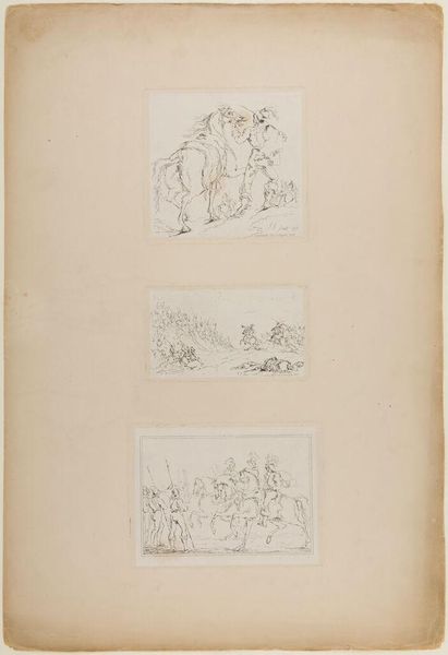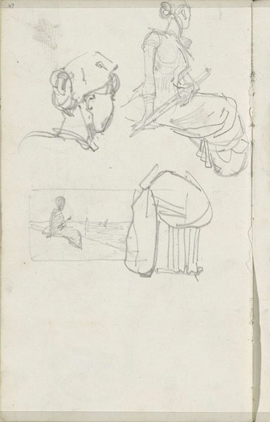 Curator: This is a study of figures by Joshua Cristall. It's a pencil drawing on paper, part of the Tate collection. The sketchiness gives it a sense of immediacy. Editor: Yes, the visible pencil strokes emphasize its creation, a direct connection to the artist's hand. It feels very grounded in process. Curator: Cristall’s portrayal of working-class men suggests a concern with representing different social classes, though his perspective, of course, would be from a privileged position. Editor: Agreed. The roughness of the sketch mirrors the labor it depicts, the unrefined quality highlighting their activity and social standing. The choice of humble materials serves the subject. Curator: These figures appear on the cusp of change, perhaps reflecting broader shifts in the social landscape of the time. It’s fascinating to consider their place within that context. Editor: Indeed. It's a testament to the power of simple materials to capture essential aspects of labor and identity.