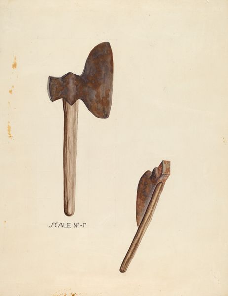 Glenn Wilson, who lived from 1855 to 1995, created this watercolor of a Pioneer Broad Axe. The object itself speaks volumes about American history, evoking ideas of frontier life, labor, and the transformation of the landscape. The axe, rendered with careful attention to its worn textures, becomes a symbol of both progress and the costs associated with it. When considering the social conditions that shape artistic production, we may ask ourselves: what does it mean to elevate a tool to the level of art? How does this elevate the status of the common worker? How does it serve as a symbol of a specific culture? The representation of this tool prompts us to consider the complex relationship between humanity and nature, civilization and wilderness, reflecting on the values and ideologies embedded in the American narrative of expansion and development. To fully understand this artwork, it might be useful to consult historical archives, folklore studies, and even literature. These resources can help us reveal the cultural significance of the depicted object.