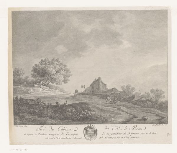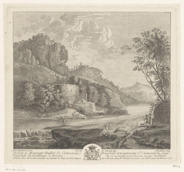 Curator: Let’s take a look at this engraving, "View on the Maese near Maastricht," dating back to 1764. The artist is unknown. Editor: Oh, I like this! It feels… expansive, almost theatrical, but in a quiet way. Like a stage set before the play begins. Curator: That theatricality resonates with the period, actually. Consider the socio-political climate—the waning of the Dutch Golden Age. The meticulous detail in landscapes became a way to document and, in some ways, monumentalize a changing world. What do you notice about its composition? Editor: The eye is led, isn’t it? First by the grazing cows and that horseman with the relaxed posture, then further along the river towards that imposing mountain in the background. It feels like an invitation to travel, to imagine. Also, notice how the artist has rendered those dramatic, billowing clouds. It is a reminder of the sheer force of nature itself, and the way nature swallows humanity over time. A bit melancholic. Curator: Yes, precisely. Landscapes during this period often served as vehicles for broader social and political commentary. Think about the accessibility of prints like this. It made landscapes like the Maas available to a broader audience, creating a shared visual language around place and national identity. These images circulate through the culture of the time, establishing an iconography of the natural world. Editor: But is it really a political statement, or perhaps the opposite? Perhaps this nostalgic portrayal of an agrarian lifestyle is meant to be an escape? An idealized version of nature. Look at how much attention is paid to the small details – the curves in the lazy cattle or the reflections in the water, yet the human figures are less clear. Maybe this romanticized countryside reflects the artist's desire to leave a society they deemed too loud. Curator: That’s an intriguing counterpoint, absolutely! And something about the print, with its delicate lines, suggests intimacy rather than grand statement. The nuances make it compelling, even centuries later. Editor: Indeed. It speaks of our ever present, shifting relationship with nature itself and where we sit within it. Something about the print, even divorced from its history, whispers about the passage of time and that's what grabs my attention now.