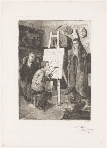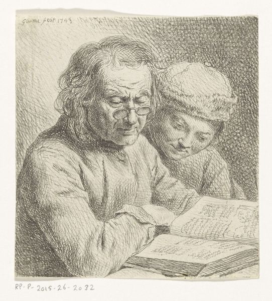 This is The Print Collector, made by Percy Lancaster sometime in the first half of the twentieth century. The etching presents a close-knit group of three figures intently studying a print, and the artist's skillful use of light and shadow creates a mood of scholarly concentration. The composition is structured to draw our eyes to the focal point, the print being examined. Lancaster uses line and texture to describe the figures' aged faces and clothing. The tonal variations give depth to the scene, and the detailed rendering of the textures, from the crinkles in their skin to the fabric of their garments, underscores the materiality of the image. The act of collecting and studying prints, a cultural activity deeply embedded in systems of knowledge and value, reflects a broader interest in representation. Through his composition, Lancaster seems to invite us to contemplate the role of the image, the relationship between the viewer and the viewed, and the enduring human desire to seek meaning through art.
