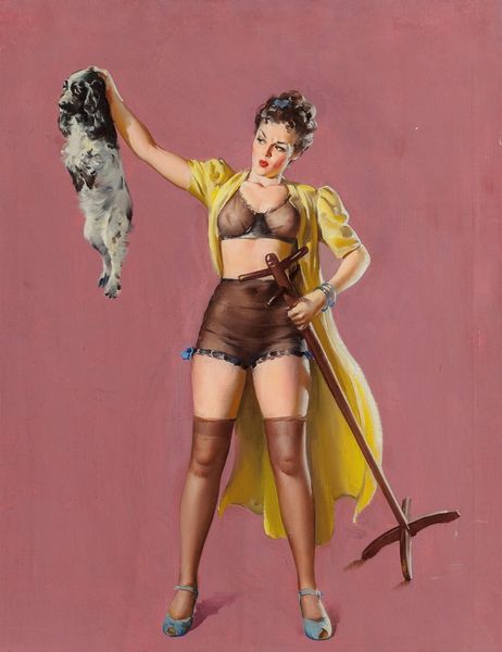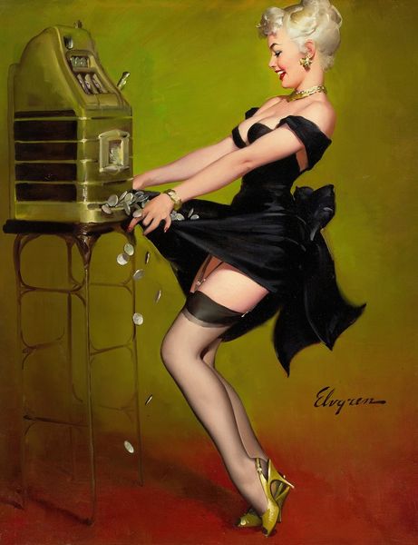 Gil Elvgren’s “Come and Get It” presents us with a playful cowgirl, an icon of American vitality, set against an idyllic, smoky campfire. The triangle she holds, historically a symbol of order in musical ensembles, takes on a different resonance here. It acts as a call to gather, an invitation to partake. Echoes of this beckoning call resonate through time—from the town crier’s bell in medieval marketplaces to the dinner bells of rural farms. The cowgirl herself, a figure embodying freedom and self-reliance, becomes a potent symbol of the American spirit. Her presence in this domestic scene disrupts traditional gender roles, hinting at a societal shift where women assert their independence. This archetypal figure, with her blend of allure and command, stirs within us the eternal dance of Eros and desire. The cyclical allure of the feminine form, an enduring motif in the human psyche, invites us to consider the evolving representation of women across epochs. Ultimately, Elvgren's image reminds us that cultural symbols are never static; they are constantly reinterpreted, reflecting our ever-changing desires and anxieties.