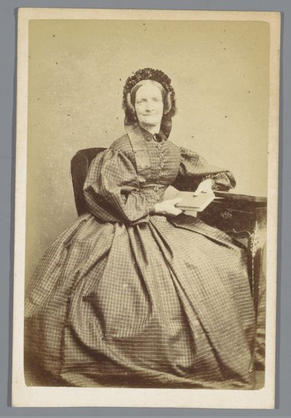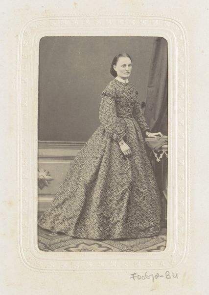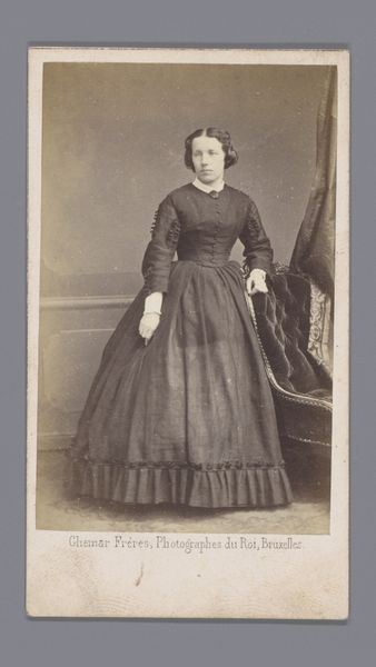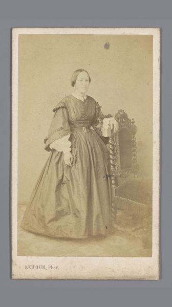 Editor: This is an albumen print by Jules Géruzet, "Portrait of an Unknown Woman by a Chair," created sometime between 1865 and 1866. It’s such a formal image. The texture of the dress is so striking against the smooth backdrop. What jumps out at you when you look at it? Curator: The meticulous composition compels my attention. Note the tonal gradation—the subtle shift from light to shadow which gives the image a sculpted effect. Consider how the patterning on the dress and chair both contrast with and mirror each other. Do you notice how the light seems to illuminate the figure from the front, yet a curtain is slightly behind? What affect does this create? Editor: Yes, that lighting is unusual! The patterned surfaces all pull your eye to different focal points. But if this weren’t a portrait, would that complexity of textures still be the focal point? Curator: Irrespective of its status as a portrait, the interplay of textures would be crucial. The arrangement of tones—dark dress, pale face, dark curtain—creates visual interest. There’s a certain tension achieved through the balance and asymmetry within the composition, drawing us to further examine the figure’s position in relation to the chair. This placement becomes its own commentary on stability versus vulnerability. Editor: It’s like the artist set up the photo to have this internal, geometric tension! Curator: Precisely! The forms of this piece demonstrate an acute understanding of visual mechanics and semiotic intention, beyond just capturing a likeness. Editor: It’s interesting to think about the choices the photographer made with textures and shading. It shows so much thought beyond just the subject herself. Curator: Indeed, and remember this meticulous selection is a product of careful planning. Photography in this era demanded precision in both arrangement and execution. It really speaks to a formal consideration that the modern viewer can take for granted!
