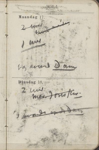 This is one of George Hendrik Breitner’s study and annotations, dating from around the turn of the 20th century. It's made with graphite on paper. The fragile paper has been inscribed with notations, almost like an aide-mémoire, revealing Breitner's thought processes. You can see faint impressions, the textured surface of the paper, and smudges from the artist's hand. The graphite lines have a provisional quality, reflecting the immediate nature of the annotations. The materiality speaks to the value of ephemera, where the process of creating a work becomes just as significant as the end result. In Breitner's time, the industrial revolution was transforming society, impacting labor practices and challenging traditional artistic hierarchies. By choosing humble materials like paper and graphite, Breitner democratizes the artistic process. This brings the means of artistic production closer to everyday life. It elevates what might otherwise be considered disposable. Ultimately, this piece reminds us that the story of art is as much about the materials, the making, and the context, as it is about any final aesthetic flourish.