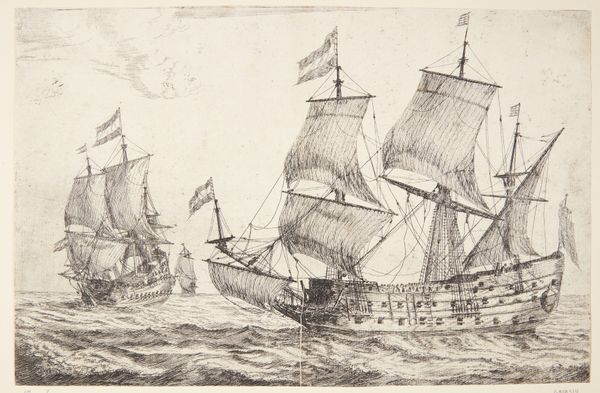 Editor: This is "Stort orlogsfartøj og en jolle," a print etching made by Reinier Nooms sometime between 1623 and 1664. I find the detail of the ships remarkable. How do you interpret this work, especially considering its historical context? Curator: Considering the Dutch Golden Age setting, this piece immediately speaks to the rise of Dutch maritime power and its role in global trade. Notice how Nooms meticulously renders the warships; they aren't merely vessels, but symbols of Dutch dominance on the seas and, consequently, their economic prosperity. Editor: So, it’s not just about the ships themselves, but what they represent politically and economically? Curator: Precisely! These ships facilitated trade, colonization, and unfortunately, also the slave trade. These images contributed to shaping a heroic narrative of Dutch maritime exploits, carefully constructing a sense of national pride and projecting power, both domestically and abroad. Consider also where this etching might have been displayed and consumed – how does that influence your understanding? Editor: Perhaps in wealthy merchants' homes, reinforcing their status and connection to this maritime power? Did Nooms intend to glorify this expansion, or simply document it? Curator: It's a fascinating ambiguity, isn't it? While there is an undeniable level of technical admiration and perhaps a desire to document, it’s almost impossible for such imagery to be devoid of ideological implications. It contributed to the visual rhetoric of Dutch power and expansion, subtly influencing public opinion. Editor: That gives me a lot to think about – the image as an active participant in shaping history rather than just reflecting it. Curator: Exactly. It’s about acknowledging how art is embedded in, and contributes to, larger historical processes.