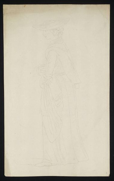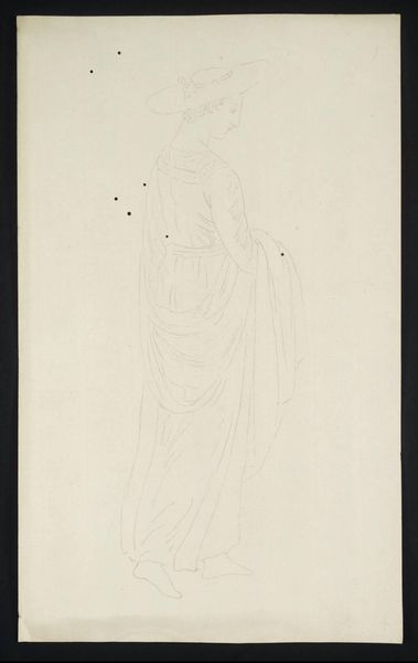 Editor: This is a drawing of a standing woman by Prince Hoare, though it doesn’t have a known title or date. It's delicate, almost ethereal, executed in pencil on paper. What strikes you most about this piece? Curator: The sketch reveals a specific process. Note the subtle variations in pencil pressure. Was this a preparatory sketch, a study of classical drapery meant to elevate Hoare's social standing through the demonstration of skillful labor? Editor: That's interesting. So, you're seeing the work itself as an artifact of Hoare's aspirations? Curator: Exactly. The chosen materials – pencil, paper – and the artist's technique speak to a particular socio-economic context and the artist's efforts to navigate it. Editor: I never thought about pencil and paper speaking so loudly before. Thank you! Curator: My pleasure. Considering the material conditions is key.
