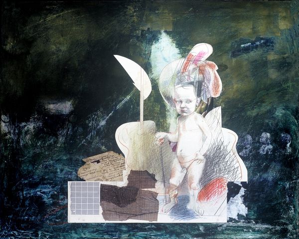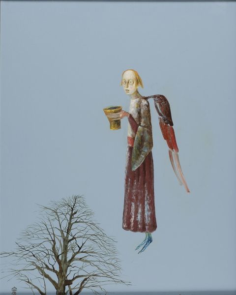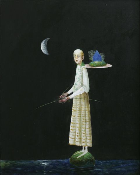 Editor: We're looking at "Girl With Blue Flowers," a painting by Stefan Caltia from 2008. The figure and the oversized fish seem to float on a sea of beige, giving it this dreamy, slightly unsettling feeling. What's your read on this, from a historical perspective? Curator: Considering the social and cultural context, I see in this piece a modern revisiting of the symbolic. Surrealism embraced the irrational, but within specific social and political dynamics. Caltia, here, gives us figuration embedded in surrealist aesthetics that challenges institutional narratives. It poses questions: How does our contemporary era interpret the boundaries between reality and dreams when art becomes a public commodity? Editor: So, are you suggesting that this challenges traditional expectations of what art should represent in contemporary culture? Curator: Precisely! The image encourages reflection on the socio-political forces affecting our understanding of identity, as highlighted through symbols of transformation, journey, or even cultural alienation within a globalized society. How might its dreamlike quality function as social commentary? Editor: The girl herself has an almost old-world look; maybe there is an implicit critique on the romanticizing of the past in today's art market. Curator: Exactly. And let's not overlook the subtle power dynamics possibly at play. Does she command the fish, or is she merely a passenger? This ambiguity mirrors art's capacity to instigate a response that reflects viewers’ societal experience. Editor: That gives me a totally different viewpoint to consider, especially on how it might interact with different viewers! Thanks! Curator: And I found myself considering what place Symbolism can claim for itself within a late-capitalist economy after our discussion. Interesting!