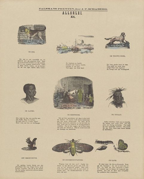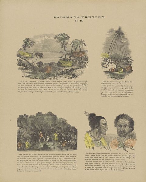 This print, Sandwicheilanden en bewoners, was created by Gerhardus Philippus Zalsman. The composition is divided into quadrants, each presenting distinct scenes. Consider the upper-left image, which depicts a native with a spear. His gaze, directed slightly off-center, invites scrutiny, while the spear and his positioning within the frame creates a tension between subject and space. To the right, notice the wooden idols. They lack detail; their simplified forms and uniform size arranged in a row encourage us to consider the structural elements inherent in both the objects themselves and their representation. Note how Zalsman uses color and form to convey a sense of otherness. The scenes in the lower quadrants present a home and a storm which evoke complex notions of settlement and displacement. Together, the images raise questions about cultural representation and colonial encounters. Note that within its formal structure, this print prompts ongoing dialogue about its historical and cultural implications.