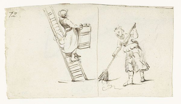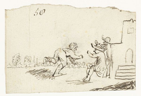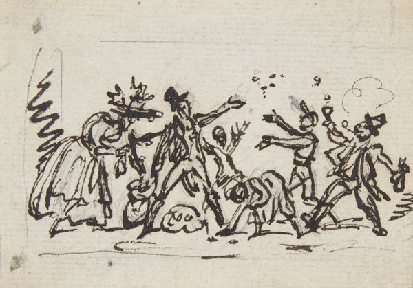 Curator: Let's talk about Moses ter Borch's "Street Scene with Working Men and Playing Boys," made around 1656. It's a drawing done in pen and ink, currently housed in the Rijksmuseum. Editor: It’s quite lively! There’s a real sense of everyday activity captured. What do you see in this piece? Curator: I see a direct engagement with the material realities of 17th-century Dutch life. The quick, almost frantic lines of the pen suggest a world driven by labor and commerce. Think about the accessibility of drawing as a medium versus painting. Who had access to what materials? The social standing can then be analyzed. Editor: That's an interesting point! So the choice of pen and ink itself is significant? Curator: Absolutely! It speaks to a certain level of... pragmatism. Ter Borch isn't just representing the world; he's documenting it with the materials at hand, reflecting maybe the efficiency demanded by the mercantile spirit of the age. Notice also how different types of labor are presented. Consider, too, what’s absent, who's not being represented here? Editor: Hmm, true. Are you saying the drawing itself, the materiality of it, is part of the story? It influences what the audience understands, not only just the subject in general but maybe deeper social and class themes? Curator: Precisely! The seemingly simple pen and ink drawing becomes a complex statement about the means of production and representation. Editor: I never thought about it that way, fascinating. Curator: By considering the materials and methods, we've gone deeper than just aesthetic appreciation; we've seen how art engages with, and is shaped by, the economic and social forces around it.