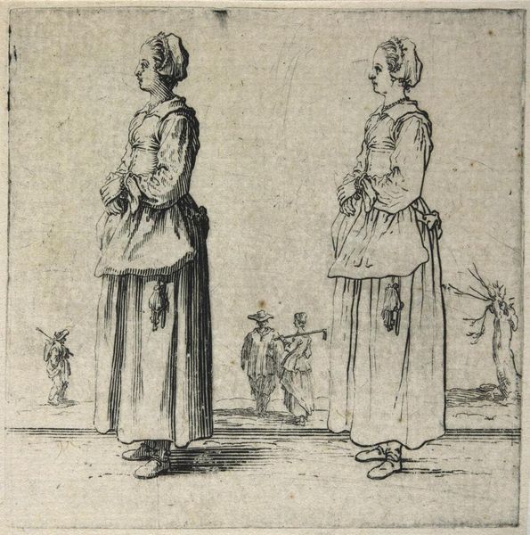 Curator: Here we have Jacques Callot’s diminutive etching, "Peasant Woman Turned Toward the Left, a Basket on Her Arm," housed at the Harvard Art Museums. Editor: It feels like a study of form. Austere, but there’s a stark elegance in its simplicity. Curator: Absolutely. Notice how Callot uses the etching technique to create delicate lines that define the woman’s figure and the folds of her clothing. The composition, while simple, employs repetition to guide the eye. Editor: And how does the artist position this peasant woman within the social hierarchy of her time? Does the print serve to elevate or perhaps subtly critique the societal structures that define her role? The inclusion of what appear to be other figures in the background seems almost like a stage. Curator: Callot, with his mastery of line, captures the essential characteristics of his subjects. It's pure form, stripped of sentimentality. Editor: But it’s precisely in that stripping away that we find the opportunity to engage with the social realities she embodies. Curator: A compelling exercise in form and social commentary, wouldn't you agree? Editor: Indubitably, an intriguing intersection of the objective and the subjective.