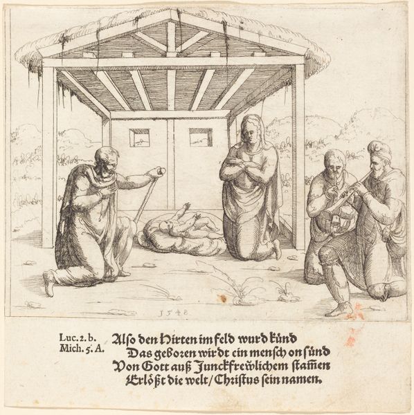 Curator: Take a look at this engraving, Balak's Sacrifice, and Balaam's Prophecy, created by Augustin Hirschvogel in 1548. It's an interpretation of a biblical narrative, rendered with meticulous line work. Editor: It's stark, isn't it? The linear quality gives it a sort of urgent feel, despite depicting a rather ritualistic scene. The composition feels quite theatrical; it's almost like looking at a stage set. Curator: Precisely! The spatial arrangement does lend a sense of constructed drama. We see Balak and Balaam prominently in the foreground, gesturing towards multiple sacrificial altars blazing in the middle ground. The background is reserved for the divine intervention that's so integral to the story. Hirschvogel packs quite a lot of narrative into one image. Editor: And such economical means, really. It is a reminder of how powerful line alone can be in storytelling. Think of comic books or animation! It's fascinating to see this biblical narrative filtered through the aesthetic sensibilities of the Northern Renaissance. Were such stories particularly potent at the time? Curator: Absolutely. This imagery coincided with religious and political upheaval across Europe. Hirschvogel's decision to portray this particular episode, where Balaam is divinely prevented from cursing the Israelites, certainly resonated with contemporary concerns about divine favor and protection. It plays with ideas about power and influence in a very volatile world. Editor: The visual economy speaks to something else too, I think. Look at how simply the landscape is evoked, or those almost naive renderings of angels. Perhaps there was an active choice to distill this story into an essence—accessible, but layered with significance. This image functions as a kind of public assertion, declaring where loyalties ought to be fixed. Curator: The landscape aspect shouldn't be understated. There’s that star shining atop everything! Its appearance gives context and depth, doesn’t it? The overall impression leaves me wondering just how consciously engaged he was with matters of divine representation. Editor: Well, given the political climate, I suspect those choices weren't arbitrary at all! Considering that even today religious imagery has great symbolic power. Ultimately, it makes you appreciate the power that these smaller, almost unassuming prints, could wield during that time.