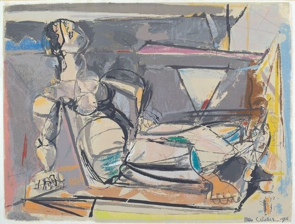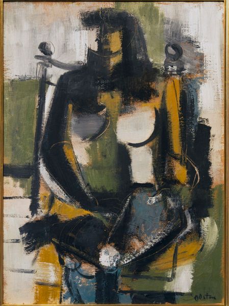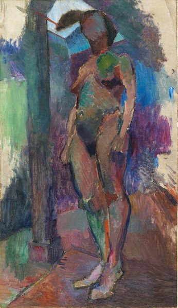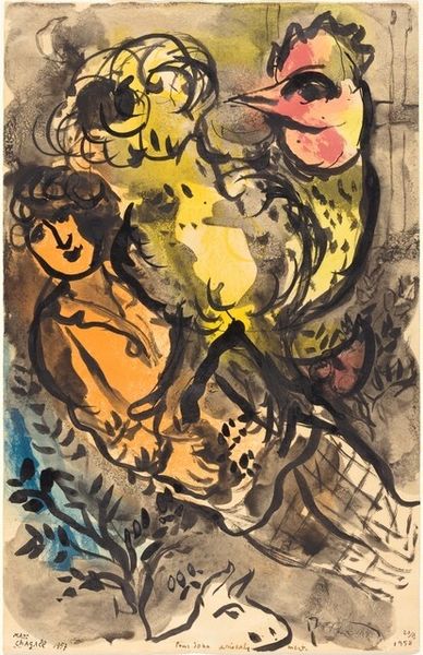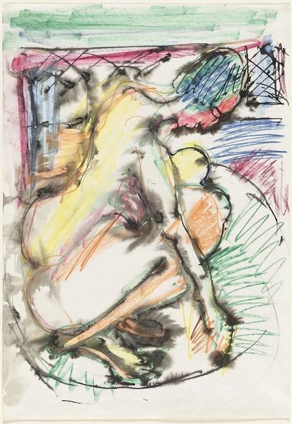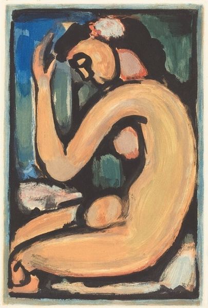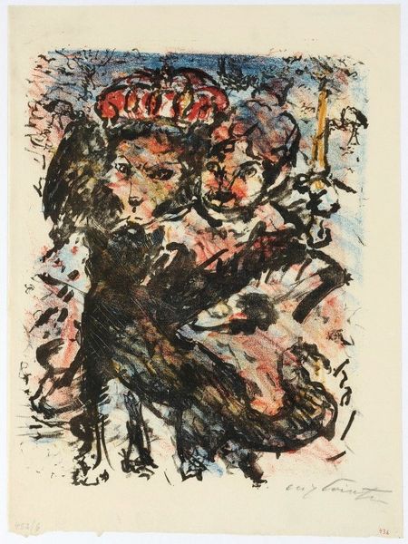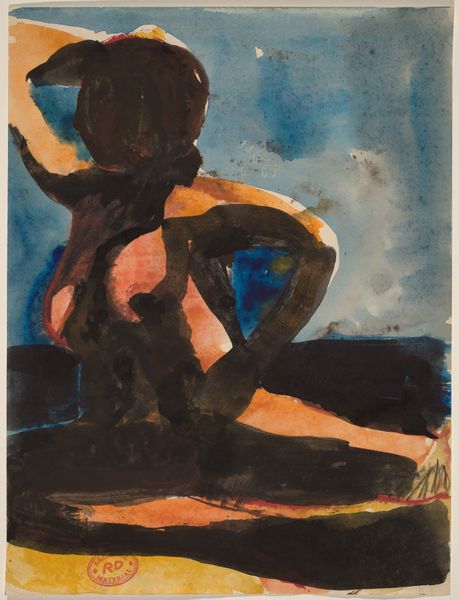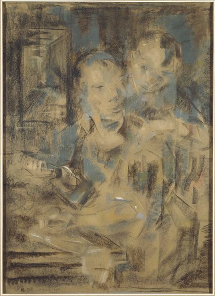 Curator: What immediately strikes me about this watercolor is its palpable melancholy, a somber atmosphere clinging to these figures in what Georges Rouault titles "Café Scene," created in 1906. Editor: Melancholy, yes, but look at how Rouault achieved it! He built this world, or perhaps a shadow of a world, with layers of diluted watercolor. Observe how the fluid washes, almost brutally applied, allow the underlayers to bleed through, creating a kind of raw, immediate document of both form and affect. It reflects the socio-economic realities inherent in a rapidly industrializing France. Curator: The bleeding hues definitely add to the sense of unrest. I’m wondering about the sitters – those shadowy figures, trapped, or perhaps choosing to be in the shadowy café interior. Do you think it represents some deeper unrest beyond just its visible, material execution? Editor: Without a doubt! The subject is expressionistically rendered, faces dissolving into distorted masks, almost devoid of specificity. The female figure is presented from an oblique angle, one eye seemingly stretched, features collapsing. She, and the companion that recedes into the ground beyond, becomes a symbol, embodying alienation amid social spaces of fleeting connection and consumption. Note the glass that stands between them. Curator: Consumption and alienation; this reading reminds me how critical Rouault was about social inequalities of his time. But there's also an intimacy to the watercolor technique here—it's fragile, quick, revealing. The gestural application brings a vulnerability despite the rather grim subject. Do you see that interplay at all? Editor: Exactly! We cannot neglect Rouault’s engagement with mass printing either! The very material nature of drawing here invites such considerations. His engagement with these themes extended beyond painting. The rapid execution becomes part of the art work’s conceptual project, critiquing commodification and disposability prevalent in consumer society. Curator: I like how the very quick, almost careless technique reinforces his perspective about quick or dismissive ways people in a café engage with one another. A kind of production that mirrors theme. It's quite bleak. Editor: Yes, bleak, but powerfully bleak. This artwork offers us not only aesthetic enjoyment but also spurs thoughtful meditation about society's margins—and perhaps our own roles within it. Curator: Indeed, it makes you ponder the hidden costs of even fleeting moments of pleasure and disconnection, especially during a turning-point period for modern Europe.