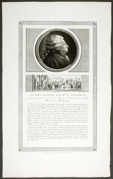 Editor: This is “Néker, Minister of State and General Director of Finances, from Tableaux historiques de la Révolution Française,” created between 1798 and 1804 by Levachez, père et fils. It’s an engraving, etching and print on paper. The composition seems to be split, with a portrait up top and what looks like a scene from the Revolution below. What's your take on how these pieces work together? Curator: The combination of portraiture with scenes of social unrest immediately suggests an interest in the material conditions that produce both individual power and popular uprising. Think about the labor involved in creating such prints. Who was consuming these images and why? Were they for the wealthy elite or the burgeoning middle class seeking to understand, and perhaps even participate in, the changing social order? Editor: So, it’s about how this image was circulated and consumed? How does that connect to Necker himself? Curator: Exactly. Necker was a powerful figure, deeply implicated in the economic system of pre-Revolutionary France. This print, then, isn’t just a neutral depiction. Consider the materials—the paper, the ink, the plates used for etching. These all speak to specific modes of production and distribution, and reflect the growing importance of print media in shaping public opinion. The scenes below the portrait indicate a direct link between the decisions he made, or influenced, and the people rising up. Do you notice anything particular about *how* those people are represented? Editor: They're kind of a faceless mob. Which makes me wonder about the intentions behind this image and the process used. Curator: Precisely. Who is in control of this visual narrative? By looking at the means of production and distribution, and by considering the social context in which it was created and consumed, we gain a richer understanding of this historical moment. We can also question the role this work plays in perpetuating power structures or in attempting to subvert them. Editor: That’s fascinating. I never considered the role the materials themselves played in interpreting the message! Curator: Seeing art this way helps us acknowledge not just what’s depicted, but how and *why* it was made.