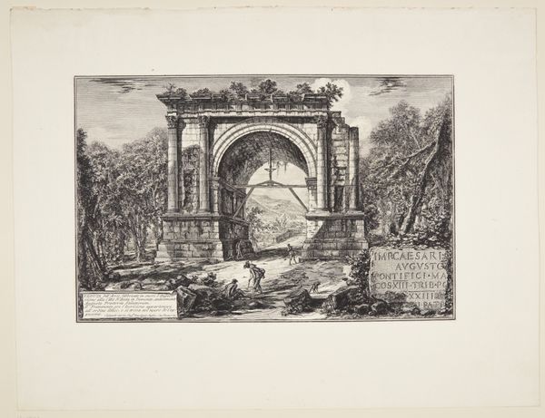 Editor: This is Giovanni Battista Piranesi’s "View of the Remains of a covered portico to part of the Villa called the 'Sette Bassi' on the Road to Frascati", an engraving from 1766. I am struck by the romanticism of the decaying architecture. What kind of historical context can you provide to better understand the image? Curator: Well, Piranesi was deeply invested in representing Roman antiquity, but through a lens shaped by his own time. It’s interesting to consider how he wasn't just documenting ruins, but participating in the construction of a particular vision of Rome, wasn’t he? How does this image engage with ideas about the relationship between the present and the past? Editor: It does seem to suggest a cyclical view of civilization - rising and falling, leaving monumental remains. The architecture overwhelms the figures that we see. Curator: Exactly! These images weren't just aesthetic exercises; they played a role in shaping how people perceived Rome and its legacy. He carefully uses scale to underscore human insignificance, no? Consider also how the print medium allows these ideas to be widely disseminated and become part of the cultural imagination. Do you feel that impacts its overall influence on art history? Editor: It certainly speaks to accessibility and influence, especially before photography! Thinking about the image in that light makes it a commentary on cultural memory, not just a landscape. It also touches on the public perception of ruins, which can then be easily shared through this type of medium. Curator: Precisely. By understanding its role in circulating ideas and influencing perceptions of Roman history, we appreciate Piranesi's print not just as a picture, but as an agent in the ongoing process of constructing historical narratives and thinking about Rome in a particular manner. Editor: I now see it as more than just a landscape print; it's a politically charged commentary on the perception of history, Roman legacy and societal structure, accessible to the masses. That makes me want to investigate further!