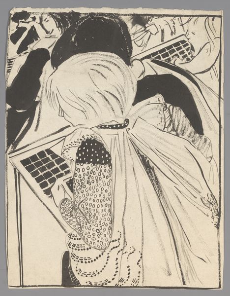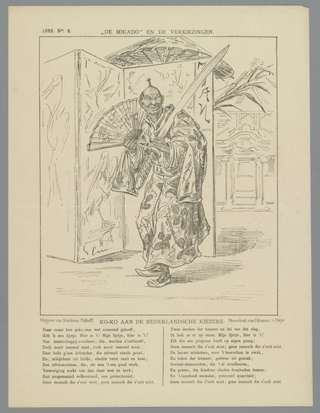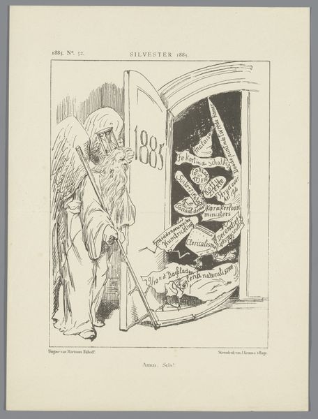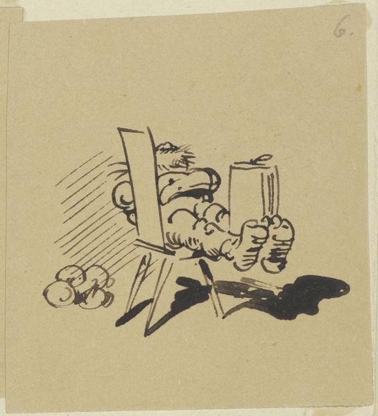 Curator: Look at this powerful drawing titled "Metro," likely from 1945 or 1946, by the Algemeene Vrije Illegale Drukkerij. It's rendered in ink on paper, part of a printed narrative, seemingly from a publication. What’s your immediate response? Editor: Visually, it’s grotesque, deliberately so. It strikes me as a commentary on power and manipulation, perhaps even corruption. There's a Frankensteinian feel, literally signaled by a little title on a book on the left! But who's operating here? Curator: Considering its production by the Algemeene Vrije Illegale Drukkerij, a free press group during the war, this work needs to be placed against the Nazi occupation and the Dutch collaborationist movements. I think it's probably an allegorical cartoon in direct opposition of collaboration with oppressors. What could you tell me about such depictions during that period? Editor: During that time, such underground presses often served as vital sources of information and resistance. Considering it, "Metro" takes on greater significance. We should examine how such political messaging was delivered outside officially sanctioned channels. Let me see here, I wonder about the clear letters all over the body of this assembled person - UN, R.K. L.S.A - likely meant to signify different collaborating or infiltrated national organizations. Curator: Absolutely. The drawing style, while caricatured, served to underscore specific traits associated with each group or figure, often tapping into popular sentiments and anxieties about collaboration, power and propaganda. Note how, for instance, they placed "UNI" on the person's head, potentially meaning an intent to dehumanize it. Editor: I do appreciate how it all culminates into an angry monster; very effectively visualized by what seems to be an ongoing experiment in a lab. A hand appears to be stitching pieces on the body of the creature, implying the violent making of monstrosities. In looking at this illustration, I realize the significance of free press and wonder, how was this perceived? Curator: These illegal publications were not merely sources of news; they were acts of defiance, offering alternative perspectives and fostering resistance against collaborationist and Nazi ideologies. Their reach helped to shape and influence societal responses. Editor: Thinking about the context, and reading in between its lines of symbolism... the artwork speaks volumes about resisting oppression, in the moment and even to the day.