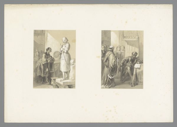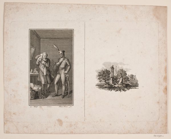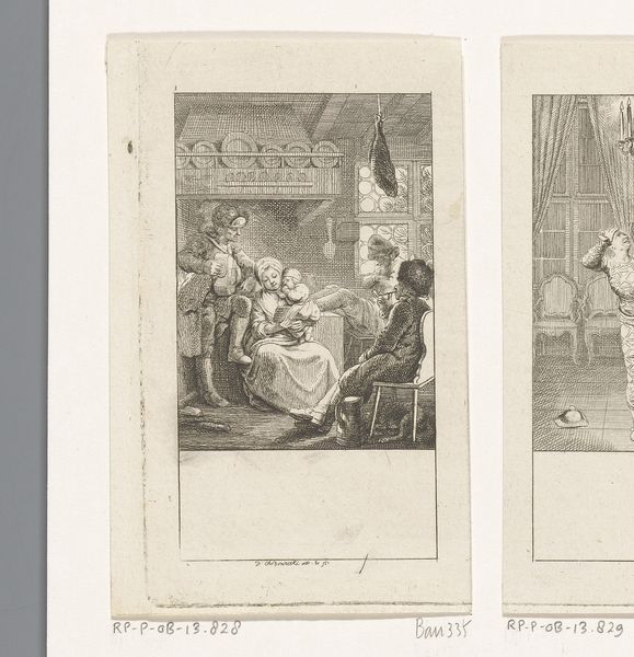Curator: Here we have "Meisje met hond en kind op boerenerf," or "Girl with dog and child on a farmyard," a print made around 1840 by François Grenier. It resides here at the Rijksmuseum. Editor: Immediately, the subdued tones strike me, a certain stillness captured through careful engraving. It feels like a frozen moment from everyday rural life. Curator: It is an engraving, so we're dealing with the labor of the artist using tools to physically cut into a metal plate. The marks, the lines themselves, carry the meaning as much as the depicted scene. Think of the intense labor and material understanding required. Editor: Absolutely, the linear precision yields a charming interplay of light and shadow. Structurally, Grenier’s deployment of depth within the composition is interesting—the background figures fading softly. What do you make of the narrative aspect? Curator: The scenes portray genre-painting in that it depicts common folks, and elements of history painting appear within these "everyday" situations. I believe this brings an artistic intention, but, ultimately, we are also talking about representations of work, class, and social conditions in rural life, not pure entertainment. Editor: Do you think the realism serves solely to record or does it propose something more, perhaps an idealized or romantic vision of this existence? Curator: I suspect a bit of both. This would have circulated as a print. How does art reach an audience, and what does that distribution suggest? Consider what a print like this signified about accessibility and value. Editor: Fair enough. The distribution undoubtedly affects how we interpret value here. However, if we focus on its form: The textural detail, for instance—how Grenier renders the rough wood versus soft fabrics through hatching—offers an invitation into this pastoral setting. Curator: Right, and where did Grenier acquire this skillset? Who taught this person, how did Grenier get materials to work? How were their skills valued? All are vital to consider. Editor: Certainly important perspectives, even though our primary interest remains grasping the intrinsic visual organization that defines this piece, how elements such as form and tonality interact within its pictorial space. Curator: The point is how such intrinsic visual organizations serve—or subvert—external socioeconomic ones! Editor: A lovely closing statement for me as well, and in conclusion, an object is, as you said, made in the context of socioeconomic structures, but it exists with visual cues that may offer us additional access and a better formal analysis, ultimately, can exist apart.