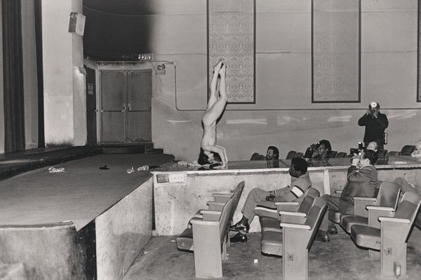 Bill Dane made this gelatin silver print titled Sacramento, with the subtext “(“Fat Lady” circus act)”, in the 20th century. This is a black and white image, but the real subject here is light, and it's Dane’s treatment of it. In this image, the light is like an X-ray, it reveals the texture of the circus posters in the background, with their strange and antiquated lettering, the grain of the wooden boards of the stage, and the faces and hands of the performers. Look closely at the figure of the 'Fat Lady' looming in the background. She looks like she is drawn with oil pastels on cheap paper - and the details are amazing. The soft focus and the way that the artist allows certain areas to fall into shadow gives the whole scene a melancholic feel. You can almost hear the sounds of the fairground. Dane, like his contemporary Garry Winogrand, was interested in photographing public spaces and in the theatre of everyday life. Both artists embrace contingency, welcoming chance encounters and spontaneous compositions. It’s up to us to make sense of it all.