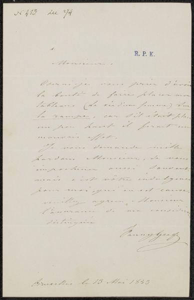 Editor: This is "Brief aan anoniem," or "Letter to Anonymous," a pen and ink drawing on paper from 1854 by Albert Neuhuys, housed here at the Rijksmuseum. The old cursive is beautiful, yet hard to read. What’s your interpretation of the work’s impact and context? Curator: Ah, a glimpse into a vanished world of penmanship and personal correspondence! Think of this not just as a drawing, but as a time capsule. It captures the *weight* a letter held then, wouldn’t you agree? Before instant communication, receiving such a handwritten note, potentially carrying significant news or heartfelt sentiments… well, it was an *event*. I wonder who the recipient was, and what their reaction was to reading those swirling, elegant lines. What secrets does this anonymous letter contain? And Albert Neuhuys, what brought him to draw and preserve such an item, in its Romantic style? Editor: That idea of a time capsule is beautiful! I hadn’t considered the weight of the object itself. Was Neuhuys commenting on something larger? Curator: Perhaps he was capturing a slice of daily life, elevating the mundane to the level of art, preserving not just the words, but the *essence* of communication. This drawing really speaks of Romanticism - that movement reveling in sentiment and subjective experience. What do you feel from it? Editor: Definitely a strong sense of intimacy and longing. It’s amazing how much feeling can be conveyed through something as simple as handwriting. Curator: Absolutely! It makes you think about the power we've lost, trading the considered for the quick. Editor: I'll certainly pause longer when viewing handwritten text from now on. It’s more than just information; it’s a tangible piece of history.