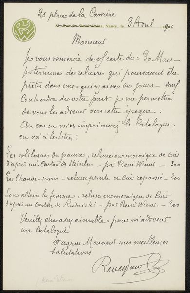 Editor: This is "Brief aan Philip Zilcken en Henriette Wilhelmina van Baak," a drawing in ink on paper, potentially from 1925, by Marguerite Stevens. It's a handwritten letter, and the script itself feels like the primary artistic element. How would you interpret this piece, focusing on its intrinsic qualities? Curator: The first element that strikes me is the meticulous nature of the script. Notice the almost geometric consistency in letter formation and line spacing. It's not simply writing; it's a consciously crafted visual system, operating within the parameters of legibility and expressiveness. Editor: So, the focus is less on the content of the letter and more on how it looks? Curator: Precisely. We can examine how the ink's darkness and thinness interact with the paper's texture, generating contrast. The hand-drawn quality imbues it with unique structural interest when one looks at its line work. Furthermore, we see a hierarchy constructed by shifts in script size; the salutation stands out distinctly, drawing the viewer in. How does this hierarchy guide your eye across the image? Editor: It does lead my eye downwards, but I also notice the address at the top; that’s important for contextual reasons. It anchors the image to a time and place. Curator: However, does the specificity of the address truly alter your perception of the visual composition? Arguably, the upper right and lower left corners create a certain balance. The formal qualities suggest that the blank spaces perform a critical function here. They permit the drawn forms to “breathe,” inviting careful observation of this script as image. Editor: I see your point. By emphasizing form over context, we notice details in the lettering and composition we might otherwise miss. I never would have looked at it that way without your insight. Curator: Indeed. Focusing on these intrinsic qualities allows one to decode the artistry even within such commonplace objects.