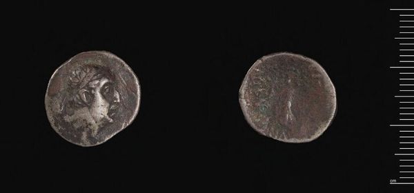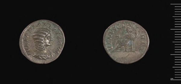 Editor: This is a Denarius coin of Faustina II, currently held at the Harvard Art Museums. It looks well-worn, almost ghostly. What stands out to you in its form? Curator: Observe the relief. The portrait's profile, though aged by time, reveals a deliberate emphasis on classical features. The reverse mirrors this structural clarity with its allegorical figure. The composition is designed for legibility, even at this scale. Editor: So, the value is in the clean design, even with the coin’s wear? Curator: Precisely. The aesthetic intention remains discernible despite the degradation of the material surface. The structure still communicates power. Editor: Interesting, I see that now. Thanks for pointing it out! Curator: My pleasure. It is a lesson in the enduring language of form.