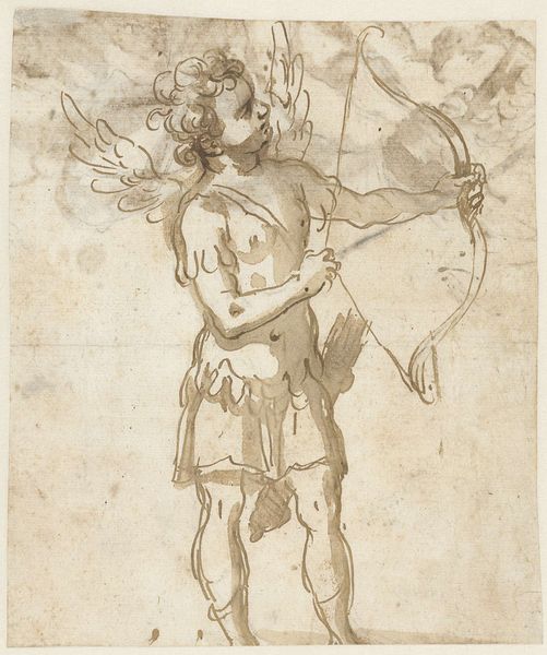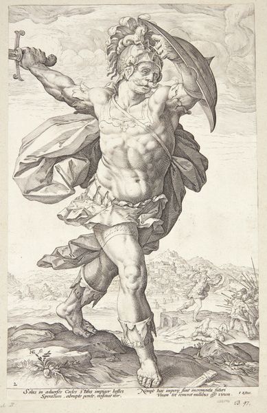 Curator: It has this quiet power, don't you think? Editor: It does. It's "The Standard Bearer" by Lucas van Leyden, created sometime between 1505 and 1515. It's an engraving, so we are seeing an image meticulously carved into a metal plate and then printed. The work is currently at the Metropolitan Museum of Art. Curator: Yes, he’s an interesting chap. A little theatrical and, dare I say, slightly absurd, but with a kind of quiet stoicism too. The detail in the face gets me every time. It's not quite portraiture, but there is personality there. Editor: It’s curious, isn’t it? This semi-nude figure, carrying a massive flag... it has elements of classical heroic imagery, yet the proportions are off. Is it a comment on military might or a sly parody? And that almost melancholic expression… Curator: Exactly! Is it meant to elevate the idea of duty and valor or subtly undercut it? The flag itself, so prominent, almost feels like a burden he’s reluctantly carrying. The feather on his head, like he's been plucked straight out of the commedia dell’arte...a fool playing hero. Editor: I love the landscape receding behind him. Even in the small scale of the engraving, you get a sense of vastness, drawing you into this tableau vivant. It makes me consider the broader world beyond this figure’s isolated stance. He's stranded between being a hero and a pauper. Curator: Indeed. Van Leyden uses symbolism here. Consider the exposed physique combined with elaborate headdress. There’s a play on classical ideals of the perfect, strong body juxtaposed with gaudy, unnecessary adornments, all to reflect the weight or burden, if you will, on being “heroic”. A rather poignant figure, truly. Editor: It's fascinating how this relatively small engraving invites so many different interpretations. It proves images carry complexities that keep shifting through time. Curator: Exactly. Images are mirrors. The symbols become us. I like that thought. Editor: An excellent note to end on. Thank you.