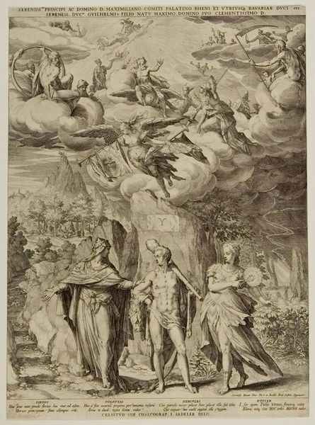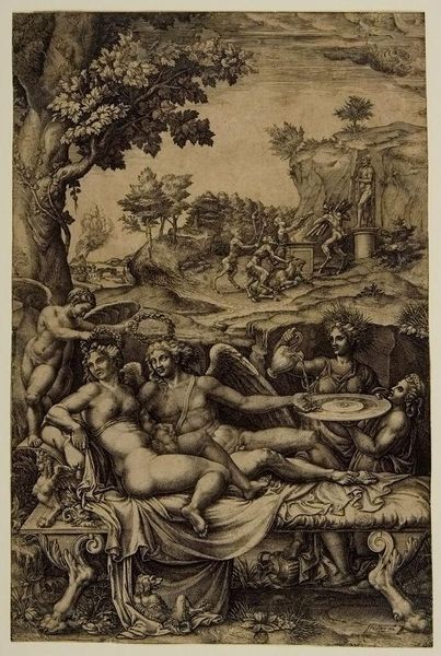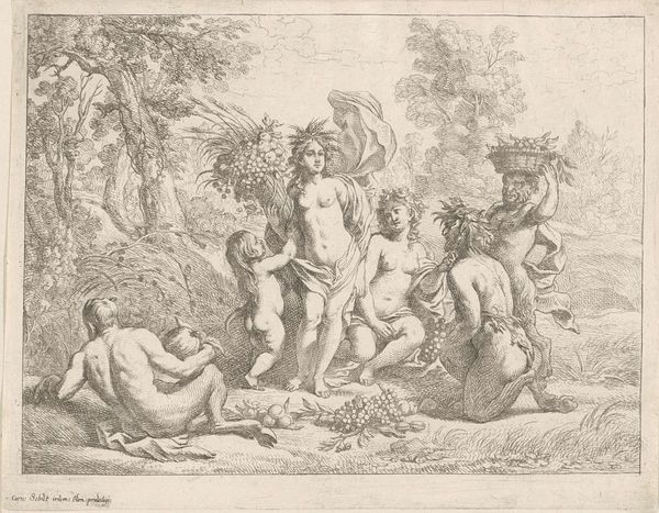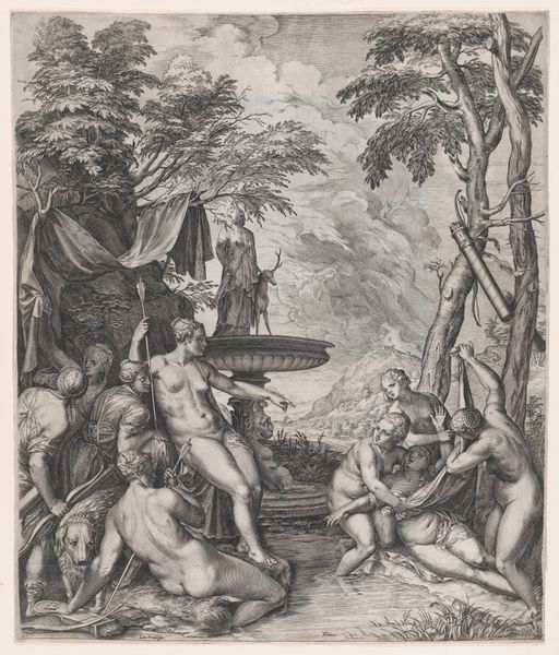 Editor: This is "Diana and Callisto" by Cornelis Cort. It's an engraving, so black and white, and it depicts this dramatic scene of women bathing. It feels so tense! What's your interpretation? Curator: It's intense, isn't it? Cort captures a pivotal moment. Diana, goddess of the hunt, discovers Callisto's pregnancy, a violation of her vow of chastity. Think of the communal aspect of bathing, then the sudden exposure. Editor: So, the other women are essentially outing her? Curator: Exactly! Consider the power dynamics, the judgment... it echoes even today. What do you make of Diana's gesture? Editor: Accusatory. But I also see a loss of innocence, for everyone involved. Curator: I agree. It's a powerful snapshot of betrayal and the harsh consequences of societal expectations.