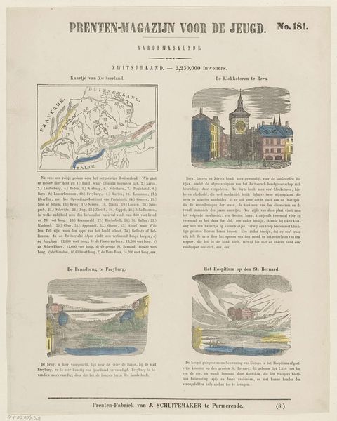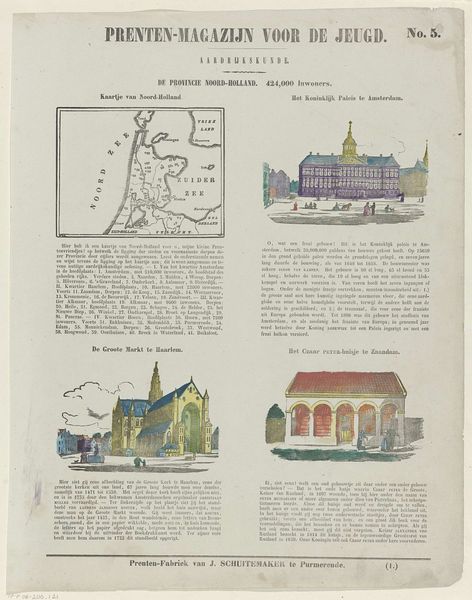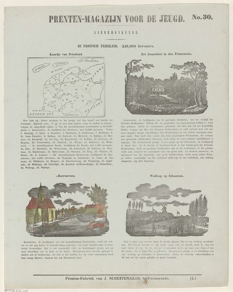 Curator: This lithograph, titled "De provincie Groningen. 192,000 inwoners," was created sometime between 1850 and 1881. It now resides at the Rijksmuseum. Quite a fascinating specimen of graphic art. Editor: Groningen in monochrome, it’s almost mournful! Like a lost page from some explorer's damp journal found tucked away. But in a beautiful way... nostalgic, wouldn't you say? Curator: I would describe it as more illustrative, focused on conveying geographic and demographic information. Note how the composition is carefully segmented to showcase different aspects of the province. See the map, the cityscape of Groningen, Appingedam, and finally a monument. Editor: Yes, but each vignette feels like its own contained memory. Appingedam, nestled by the water... almost feels like a wistful recollection of small-town life. I imagine quiet conversations by the water, or a farmer heading out for work, thinking this graphic could have been drawn by an ancestor. Curator: Your personal response is insightful. Semiotically speaking, the arrangement conveys order and hierarchy, crucial for regionalist art meant for educational purposes. The print method also has significance in allowing its wide dissemination. Editor: And the color wash adds this layer of time... See how certain areas are highlighted as if someone actually physically touched this and tried to define each border by the population regions during each phase of settlement. Do you see how Groningen bleeds into a Prussian blue as a nod to those cold northern seas? It just enhances that dreamy distance, I can’t help but look closer. Curator: You are observing how artistic elements add depth. But it's primarily a tool to educate young people about Dutch geography and demographics, which needs to be carefully studied and remembered in that time. Editor: It feels far more personal, don't you think? It almost asks us, what makes a place worth knowing, worth loving even... Besides facts. Besides, 192,000 inhabitants. Curator: Perhaps. Art serves many masters, and interpretation is indeed an individual endeavor. Editor: Always is. And the real beauty often lies where intention meets imagination.