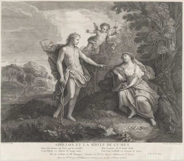 Editor: This is Simon Charles Miger's "Apollo and Marsyas," located at the Harvard Art Museums. It's quite striking; the composition feels very dynamic, almost violent. What do you make of the artist's choices in rendering this scene? Curator: Indeed. Note the stark contrast between Apollo's smooth, idealized form and the contorted, strained bodies surrounding Marsyas. Miger uses line and shading to differentiate the divine and the mortal, creating a visual hierarchy. Observe also the interplay of light and shadow, emphasizing the emotional intensity of the moment. Editor: That's a fascinating way to consider it. I hadn't focused on the contrast in form and how it affects the interpretation. Thank you. Curator: A rigorous engagement with the formal elements can often unlock deeper readings of the narrative. A useful experience, I think.