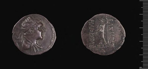 Editor: Here we have a Drachm of Demetrios I of Syria. It's a small coin with worn details, but powerful nonetheless. What kind of statement was Demetrios trying to make? Curator: It's a fascinating glimpse into how rulers use iconography to legitimize power. This coin isn't just currency; it's propaganda. Consider: who is he trying to reach, and what anxieties might they have about his rule? Editor: So the imagery is there to quell unrest, create a cohesive identity? Curator: Precisely. Currency touches everyone, so the symbolism becomes a powerful tool for shaping public perception and reinforcing power dynamics. What do you make of the chosen imagery? Editor: It's interesting to think of something so small carrying so much political weight. Curator: Absolutely. These objects offer valuable lessons in cultural messaging.