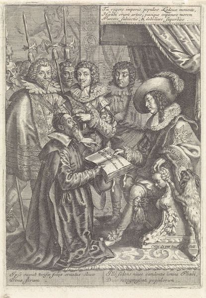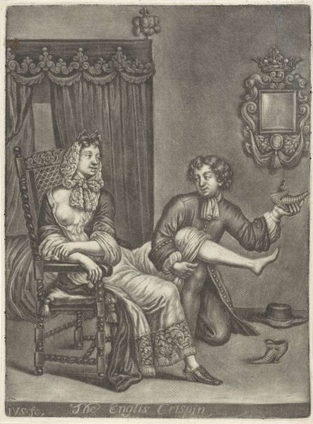 Curator: Pieter Schenk created this engraving, "Boy Offering a Tray," sometime between 1670 and 1713. Editor: Immediately, I'm struck by the controlled staging and performative stillness in the faces. It’s almost as if the figures are hyper-aware of being watched or perceived. Curator: Indeed. And engravings, particularly portraits like this, acted as powerful tools of visual communication during that era. What we read as "stillness" now might have represented idealized composure. We're looking at a clear display of wealth, and status—with what feels like highly symbolic offering between members of the family? Editor: Possibly. I am struck by what the act of ‘offering’ signifies here. What is this boy giving up and who benefits? The presence of a child performing service amplifies existing power structures within families and society more broadly. Notice that we lack any true emotional expression. The boy is faceless. It speaks volumes about his social standing, doesn’t it? Curator: It makes me wonder, though, about the deeper intent here. Are we meant to view a literal snapshot of daily life or, might Schenk have subtly challenged those very hierarchies through an understated portrayal of human connection amidst the strict social scripts of the time? Perhaps these characters have an emotional attachment we may miss? What do you make of the ever-watchful eyes of that house dog? I think Schenk masterfully renders emotional tension by contrasting that rigidity in form with soft shadows around faces. Editor: I find it difficult to imagine past oppression here. From an intersectional lens, that tension serves primarily to highlight societal inequities that were accepted at this historical moment in wealthy Europe. Even this precious little family unit, as the viewer sees, must have also acted out oppressive routines in the household with their other children. Curator: Agreed! And the permanence afforded through the medium of engraving allows such commentaries to live through history and serve our moment too. How might this imagery speak to you, as a member of our present culture? Editor: In an age that increasingly fetishizes self-determination and expression, revisiting these posed scenes serves as a stark reminder that societal performances—who holds the ‘tray’, both figuratively and materially—remain integral to negotiating and shaping our realities, however unequal.