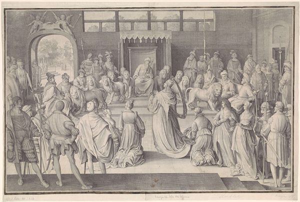 Editor: So, this is Nicolaes de Bruyn's "The Queen of Sheba Before Solomon," housed right here at Harvard. It's a monochrome print, meticulously detailed. I’m struck by the sheer number of figures and the formality of the scene. What do you make of this grand encounter? Curator: It’s like stumbling into a Renaissance play, isn't it? Bruyn captures this legendary meeting with theatrical flair. The lions flanking Solomon's throne aren't just decoration, but symbols of his wisdom and power, reflecting the era's fascination with exotic lore. Don't you think the Queen’s humble posture speaks volumes? Editor: Definitely, it's all in the body language! I hadn't considered the symbolism of the lions before. Thanks! Curator: My pleasure! It’s rewarding to find new stories tucked away in old art.