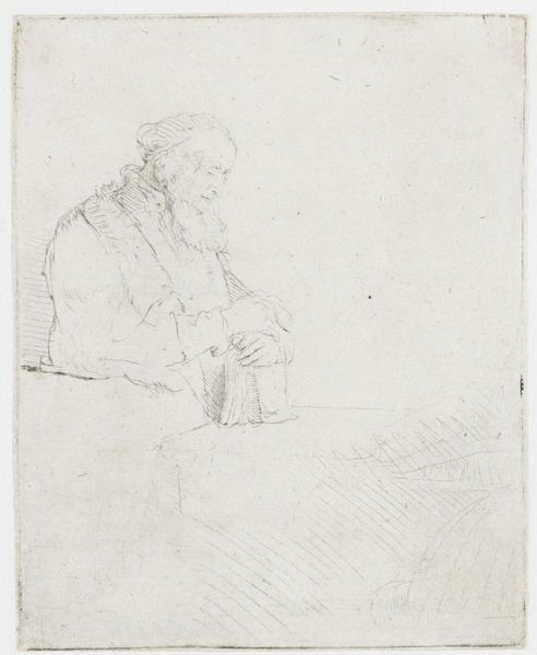 This is Rembrandt van Rijn's etching, made at an unknown date, showing an old man lost in contemplation. The dominant symbol here is the book, a motif deeply intertwined with knowledge, wisdom, and introspection. Consider how the book has appeared across time, from ancient scrolls to illuminated manuscripts, each iteration a vessel carrying the weight of history. Even the simple act of leaning, a gesture of weariness and surrender, echoes through art history, seen in depictions of melancholic philosophers and weary prophets. This image has a deeper resonance, a collective memory of seeking truth, or grappling with the limits of understanding. It's an image that engages us on a subconscious level, evoking a sense of shared humanity, as we recognize our own vulnerability and longing for meaning reflected in the old man's posture. Observe how such symbols resurface, evolve, and take on new meanings throughout history. This man, caught in a moment of reflection, transcends his time, connecting us to the timeless human experience.