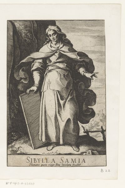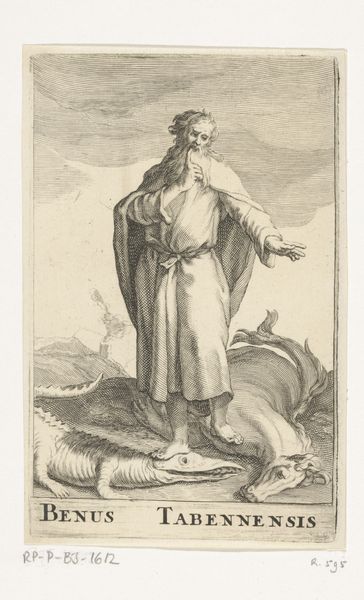 Raffaello Schiaminossi created this print called 'Verdienste' sometime between 1587 and 1622. It’s an etching, a kind of printmaking, and this one is now held in the Rijksmuseum. The print depicts a bearded figure, crowned with laurel, holding a staff and a book, standing upon a rock. This figure represents Merit, an allegorical personification of worthiness and achievement. In the late 16th and early 17th centuries, there was growing interest in classical virtues and moral concepts. Institutions such as courts and academies were interested in claiming that their members embodied such virtues. Prints like this one circulated widely and visualized that claim. To truly understand this image, we must delve into the cultural values of the period, analyzing the way honor and merit were understood and visually represented. We could start by looking at emblem books, another popular medium at the time, and institutional records to see how this image may have functioned within its social context. Understanding those contexts is key to interpreting this work.