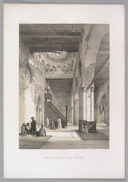 Curator: This is Louis Haghe’s "Portaal van de Onze-Lieve-Vrouwekerk te Neurenberg," created in 1845, housed right here at the Rijksmuseum. The lithograph showcases the facade of the Church of Our Lady in Nuremberg. Editor: Initially, I’m struck by the sheer textural complexity Haghe achieves. Look at the profusion of details: statuary, arches, carvings; everything crafted in minute detail in ink on paper. Curator: Haghe really demonstrates his proficiency in printmaking here. Observe how he orchestrates the light and shadow—a vital compositional element guiding our vision into the deep interior space. He is clearly a master of tonal variation. Editor: Absolutely, it's an exquisite lithograph. The contrast really makes one think about the division of labor needed to bring a medieval church into existence and later translate this magnificent monument onto paper using traditional drawing tools. How long do you think it took? Curator: The emphasis on architecture here seems central to a Romantic sensibility, underscoring an interest in a past that inspired awe. Note the figures included are small in scale, dwarfed by the magnificent church; this reinforces our feeling of the sublime. Editor: Yes, and you can't dismiss how people are integrated in it. Haghe masterfully shows how a place of worship becomes an integral element of urban fabric for common people, how it forms and shapes rituals of social activity. It becomes more than mere representation but becomes lived experience. Curator: I concur. We find a dialogue between the timeless architecture and temporal human activities, elevating everyday genre scenes to historical significance. His keen eye for the composition leads to our admiration for Haghe’s technical brilliance. Editor: For me, Haghe’s choice to work in this medium also has material and socio-political weight. Printmaking democratized art and allowed it to spread. As an item produced on paper, this architectural tribute embodies artistic access beyond pure aesthetic reverence. Curator: Thank you. Considering that point of view enriches my reading experience too. The dialogue between historical reverence and accessible art-making certainly gives new insight to how to receive this artwork. Editor: Well, I learned a lot too! Thanks to our shared discussion, I find fresh respect in the visual language that he's employed in that artwork.