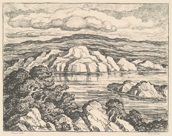Editor: We're looking at Rockwell Kent’s "Mt. Seymour, Admiralty Sound," a woodcut print from 1923. I'm struck by the contrast – the stark white mountain against that turbulent, brooding sky. What do you see in this piece? Curator: Well, for me, Kent's work always feels like a kind of visual haiku. It's spare, elemental, but hints at something immense just beyond the frame. It is very him, very rugged individualism meeting sublime nature. And the woodcut medium itself really enhances that feeling – the crisp lines, the pure blacks and whites… it's almost a spiritual exercise in reduction, stripping away all but the essential. Have you seen his illustrations for Moby Dick? A similar feeling permeates them. Editor: That makes sense. I guess the lack of color adds to that starkness, almost like it's trying to capture the raw essence of the place. I didn’t think of "haiku" to describe a visual, that's perfect for this. Curator: Exactly! And consider that Kent, a real adventurer himself, made several trips to remote, often icy locations. The austerity you feel is perhaps less about objective landscape and more about capturing an interior emotional world. What feelings come to mind? Isolation? Awe? Editor: Definitely a bit of both! The scale makes me feel small, but also kind of… hopeful, strangely? It's like a reminder that there's something bigger than myself out there. Curator: I think you’ve nailed it. Kent captured the way nature reminds us to reconsider what's within. It’s that mirror between outer and inner, mountain and mind. It feels relevant as ever, no? Editor: Absolutely. I'll definitely look at Kent's other works with that "visual haiku" idea in mind from now on. It gave me a new way to appreciating this one.