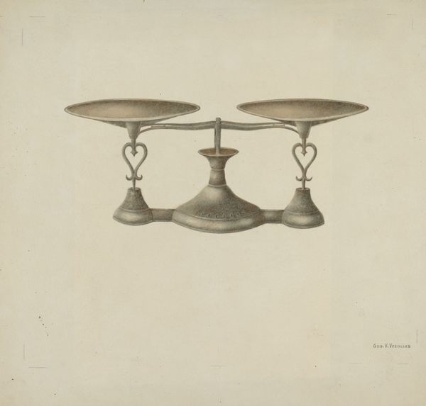 Editor: So, we're looking at "Scales," a coloured-pencil drawing, likely on paper, created by Peter Connin between 1935 and 1942. The craftsmanship feels almost meditative, wouldn't you say? What really strikes you when you see it? Curator: Meditative, yes, perfectly put! It hums with a quiet intensity. Scales… they make me think of judgment, of course, but also balance. It's rendered with such care, yet feels…unsettled somehow. Have you ever stared at something familiar for so long that it becomes alien? Editor: I know that feeling exactly! Do you think that might be the point, turning something ordinary into something…other? Curator: Precisely! Perhaps Connin is weighing more than just material objects. Maybe he’s inviting us to consider what we value, what we measure in our lives, and the weight we give to different things. What else do you notice about the composition itself? Editor: Well, the symmetry is obvious, but it’s not perfect. And those curious details decorating it make it hard to place, era-wise. Is it just me, or is there a hint of Art Deco in those embellishments? Curator: Not just you at all. It’s a beautiful blend, isn’t it? The Deco flair adds a touch of glamour to this symbol of serious reflection. And you're right; the imperfections are key. Maybe it's those subtle flaws that suggest balance is never truly static, it's always a dance. Editor: I never thought of it that way. I guess it’s not just about what we weigh, but how we hold it all in the balance, the teetering act itself. Curator: A beautiful way to think of it. Connin leaves us much to ponder, doesn’t he? A silent dialogue on every level.