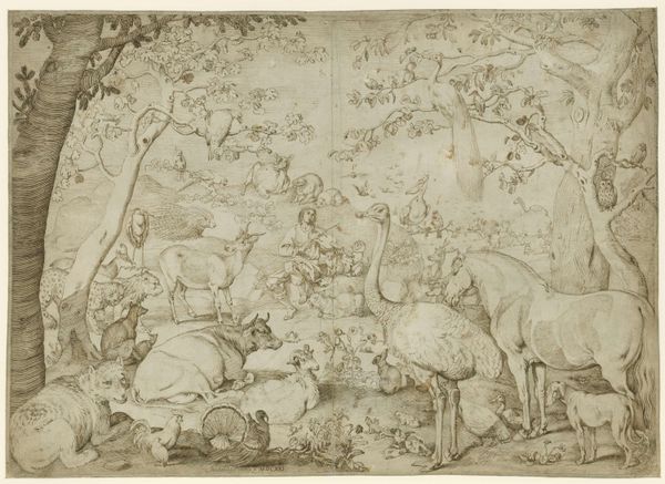 Editor: This drawing, "Garden of Eden; Creation of the Animals," from the 16th century, is an ink on paper print currently at the Metropolitan Museum of Art. It feels like a study or preparatory sketch, especially with that visible grid. What do you see in the ways this was made? Curator: What jumps out at me is the artist’s engagement with readily available materials – paper, ink, the very accessible printing press. This wasn't about rare pigments or precious metals. Instead, it’s a demonstration of how easily religious narratives could be circulated through reproducible means. Consider, too, how the grid itself, almost like a weaver’s guide, might have been crucial to mass production. How does that inform the reception of the artwork for you? Editor: It makes me think about how this image would reach a much broader audience than, say, a painting in a noble's collection. It’s interesting how accessible materials democratized the religious message, or at least made it more widely available. Curator: Exactly. And note how the skill involved wasn't necessarily about unique artistic genius, but the clever and efficient manipulation of materials. It's a form of skilled labor. Do you think that changes the artistic value in any way? Editor: It sort of shifts the focus. It's less about the artist's singular vision, more about their craft and how that craft intersects with the cultural need to disseminate these biblical stories. Almost like propaganda... Curator: In a way, yes! It highlights the function and purpose of this drawing as an object within a wider social and economic system. Ultimately, it wasn't just art; it was a product of its time, revealing so much about material culture and devotional practices of the 16th century. Editor: I guess thinking about the ink, the paper, and the printing process tells as much of a story as the animals themselves.