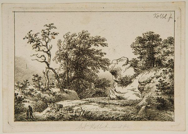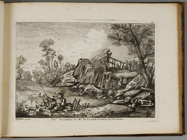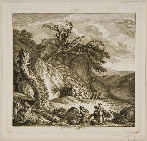 Editor: Here we have Ferdinand Kobell's "Landscape with Waterfall." It's a scene teeming with life, rendered with such intricate detail. What stands out to you in terms of its formal qualities? Curator: The dynamic interplay of light and shadow is immediately apparent. Observe how Kobell uses hatching and cross-hatching to create depth and volume. The varying densities articulate the textures of rock, foliage, and the movement of water. Editor: Yes, I see that. The composition itself is quite striking, how the waterfall seems to surge forward. Curator: Indeed. The foreground, with its jagged rocks, leads the eye into the middle ground, where the waterfall cascades, and ultimately to the distant mountains. This spatial organization, achieved through skillful manipulation of line and tone, creates a sense of depth and perspective. It is a considered arrangement. Editor: I see it now. Paying attention to the relation between foreground and background, rather than the subject matter, really enhances my understanding. Curator: Precisely. By examining the formal elements, we gain insight into the artist's intention and the aesthetic impact of the work.