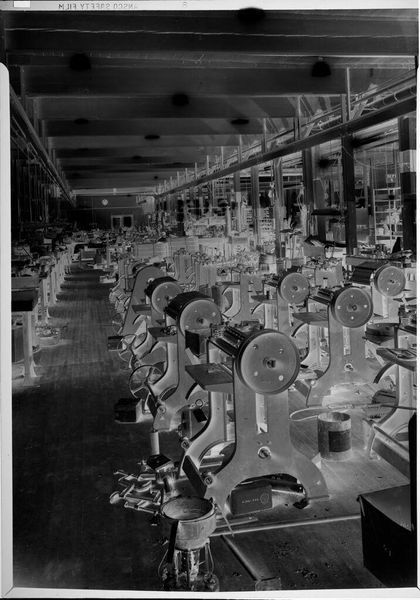 This photograph by F.R. Logan captures the Wolseley Motor Company's factory in Birmingham. The eye is immediately drawn to the mechanical repetition. Rows of engines dominate the foreground, leading back into an endless grid of workers and machinery. The monochromatic palette enhances the industrial feel, reducing everything to tones of grey and accentuating the textures of metal and brick. Each engine, though functional, becomes a unit within a larger pattern, reflecting the efficiency of mass production. The lines of hanging apparatus descend from the ceiling creating vertical striations that contrast with the horizontal arrangement of the engines. This piece evokes the early 20th century's fascination with industrial progress and efficiency. The scale and composition challenge our perception, questioning the individual's role within a larger system. It compels us to examine the beauty and potential alienation inherent in such environments. As you observe the photograph, consider how Logan uses these formal elements to portray the complex relationship between man and machine.