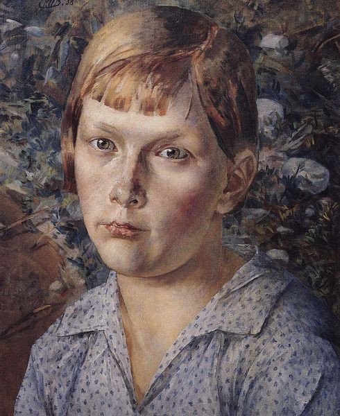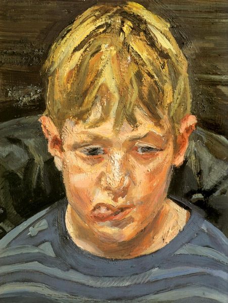 Editor: This is Lucian Freud's "Alice and Okie" from 1999, an oil painting. There’s something really raw and unflinching about the way he captures his subjects. It feels intensely personal. What do you see in this piece? Curator: This portrait resonates with me particularly through the lens of power dynamics and the representation of childhood. Freud's gaze, unflinching as you say, brings to the forefront questions about vulnerability and the adult perspective versus the child’s. It compels me to contemplate what it means to observe and interpret someone, especially someone as young as Alice, with "Okie" perched precariously on her head. How do we understand her gaze, the doll, within the broader context of representation and childhood innocence? Editor: I never considered it from that angle! The doll seems almost an afterthought. But is it? Does it tell us more about Alice or how Freud is choosing to depict her? Curator: Precisely! Think about Freud's historical position as a white male artist. The depiction of young girls in art has a loaded history. What does it mean for Freud to present Alice in this way, almost unidealized? It could be read as a departure from the more sentimental or romanticized portrayals, a sort of resistance, even, to those traditions. Or it could be, consciously or not, reproducing those power dynamics. Editor: So, it’s a conversation then? About childhood, but also about the artist's role and perspective? I guess it forces us to be aware of how we view children and how societal norms influence that vision. Curator: Exactly. And it reminds us that art is never neutral. Each brushstroke carries a history and perspective. "Alice and Okie" is an entry point into broader dialogues about power, representation, and the complexities of seeing. Editor: I’ll definitely look at Freud differently now. Curator: Me too. These conversations always leave an impression.
