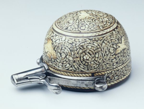 Curator: The bracelet before us, known as an "azbeg," originates from the Ida ou Nadif Amazigh, or Berber, people, dating to around the 20th century. It’s crafted primarily from silver. What strikes you first? Editor: There’s an undeniable sense of ancient power emanating from it. The intricacy of the etchings speaks volumes. The color palette is simple but deep. Curator: The application of silver, as well as the craftsmanship evident in the piece, suggests particular traditions of the people who fashioned this decorative piece. We might assume a division of labor or specialized craftsmanship behind it. Editor: Absolutely. Those geometric shapes and the spiraling foliage motifs--aren't they interesting? Almost like visual echoes resonating across centuries, hinting at something profound and ancient. Curator: The square ornaments set on the piece create visual interest, especially how each is fastened by small orbs on each side. And the patina reveals how the material shifts and tells its history. Editor: Those small ornaments! They might have stood for specific beliefs, protective charms, maybe markers of status? I wonder about the significance of the embedded gemstone, it might carry spiritual weight for the person wearing the bracelet. Curator: It makes one think of trade routes, the accessibility of materials, and potentially who was wearing these accessories. Who profits and whose labor goes unacknowledged? Editor: Definitely. The “azbeg” is not just jewelry; it’s a silent bearer of history, and social expression. It makes me reflect on the threads that connect symbols across time. Curator: Agreed. It presents itself to us both as material record and cultural carrier. A truly beautiful combination of design and material transformed through use and time. Editor: A testament, if you will, to lasting creativity.