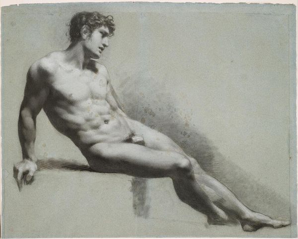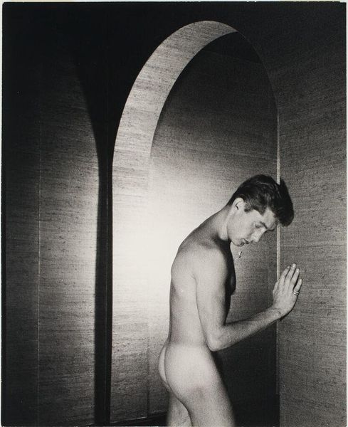Editor: Here we have Robert Mapplethorpe’s photograph of Arnold Schwarzenegger. It’s stark, the black and white really accentuates the, well, everything! I'm curious – what do you see in this portrait that maybe isn't immediately obvious? Curator: Mapplethorpe, ever the provocateur, uses classic sculptural poses with a modern celebrity. It's like a Greek god has wandered into the late 20th century, hasn't he? The ornate curtain versus the simplicity of Schwarzenegger's pose? Think about that contrast. It's not just about muscles; it's about power, presentation, and maybe a little humor, don't you think? Editor: I hadn't considered the humor, but now I see it! The juxtaposition makes it playful. Thanks! Curator: My pleasure. Art is always a conversation, isn't it?