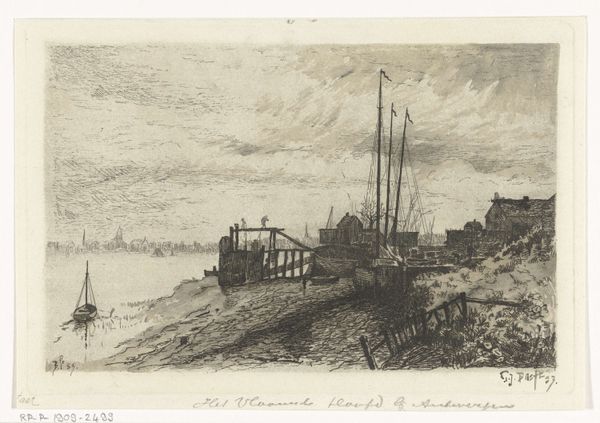 Curator: Joseph Hartogensis's 1854 etching, "River View with a Steamboat," captures a serene yet bustling riverside scene. The print medium itself provides an intimate scale that draws the viewer in. Editor: My immediate impression is one of stillness despite the steamboat. The composition, with the low horizon line, creates a sense of tranquility. It's monochromatic and the lines define the subjects perfectly. Curator: Indeed. Consider the context: 1854. The industrial revolution is reshaping society and steam power dominates the transportations sectors. This piece captures that moment through its attention to work, social interactions and transport that it reveals a dynamic period. Look at the working-class figures populating the shore—are they waiting for transportation? Editor: Semiotically, the steamboat functions as a clear signifier of progress, but visually, its soft rendering almost blends it into the sky, lessening its impact and drawing attention back to the scene along the riverbank, where a woman with a dog stands, emphasizing that the steamboat itself becomes part of a rural landscape. The clouds mirror its smoke, in a manner where Hartogensis composes his artwork in symmetry. Curator: Let’s not ignore that it's a print, etching specifically. The deliberate and time-consuming nature of the craft adds a layer to its interpretation. Each line carefully etched suggests a commentary on the changing landscape from human hand to industrial object. These tools were made in mass and the scene captured in it depicts the transformation, while embracing it too. Editor: True. But how the artist handles the line itself – the density, the direction – is what builds our perception of depth and form. Notice how the hatching creates shadows, grounding the figure and suggesting their connection to the land. It's through the composition that Hartogensis articulates not the physical nature of materials but the intrinsic artistic quality within the Romanticism style. Curator: But the etching method made artwork affordable. This allowed new audiences to access landscape and style previously exclusive to wealthy. It is a transformation in consumer culture itself and availability in print impacts social perceptions in many different ways. Editor: Ultimately, this print blends an engagement with social themes while offering an invitation to visually consider how the work’s intimate scale emphasizes those Romanticism views of rural harmony. Curator: A pertinent reminder that art is interwoven with evolving socio-economic realities.