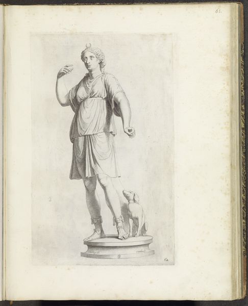 This print shows a statue of Diana and was made by Joan Comin. Diana, the Roman goddess of the hunt, is shown here with a dog, a symbol of her association with wild animals. Images of classical sculptures such as this one were often made to disseminate knowledge of classical art to a wider audience. During the Renaissance and the Enlightenment, the study of classical art and culture was seen as essential for the education of artists and intellectuals. Prints like this allowed people to study classical art even if they couldn't travel to see the sculptures themselves. The institutional history of academies of art and their influence on artistic production would be a useful place to start further research on this image. By looking at prints like this, we can better understand the role that classical art played in shaping European culture and identity.